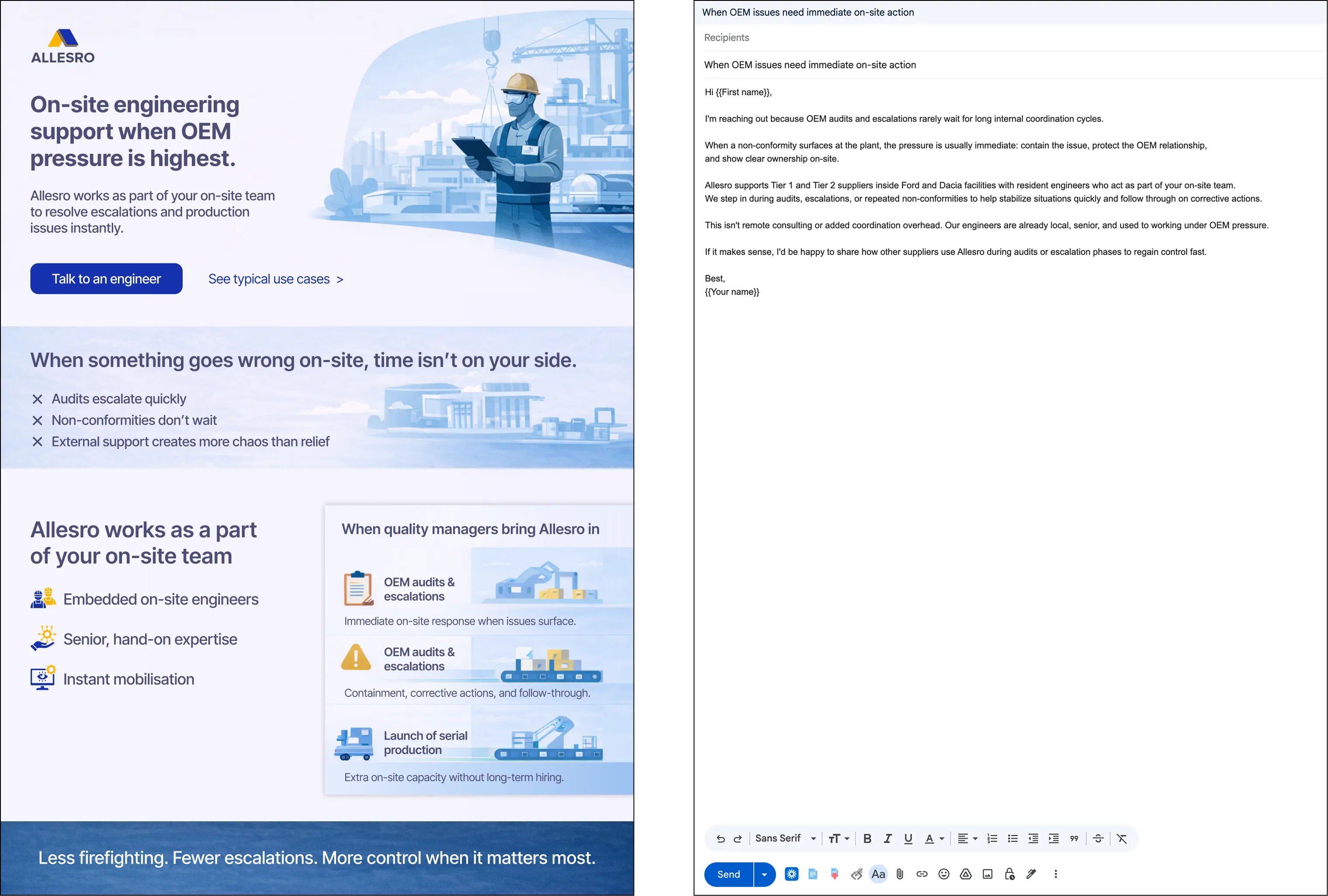 They needed a clearer, more practical way to explain what they do, why they’re different from large consultancies or remote experts, and why clients should choose them in critical situations. The project focused on clarifying their core value, building a simple messaging hierarchy, and creating sales enablement materials that help Allesro win more clients and sell with confidence under pressure.